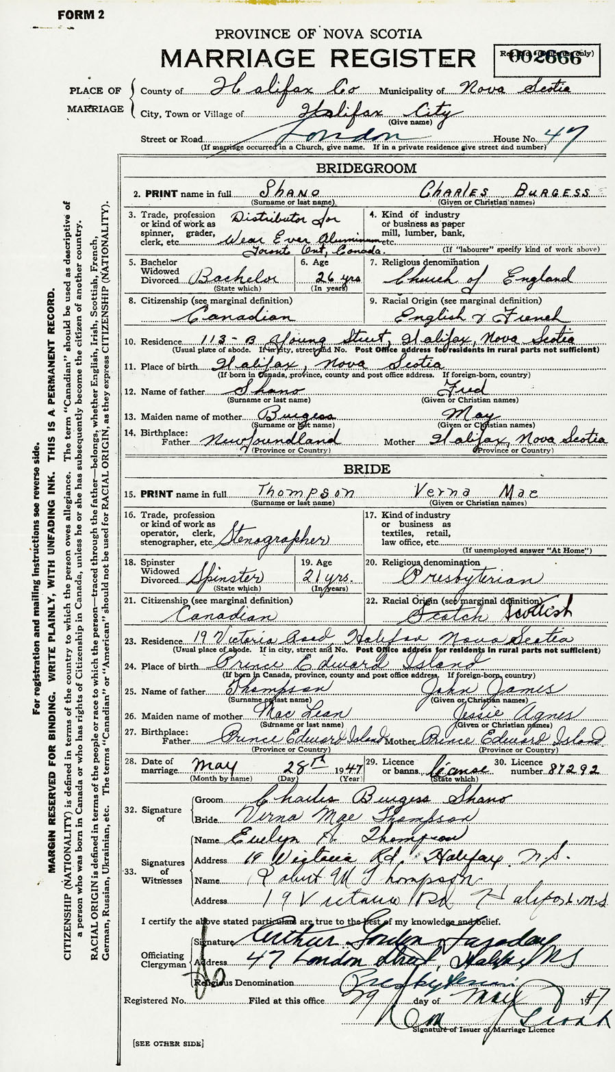 28. Date of marriage May 28 1947 29. By license or banns License 30. License number 87292