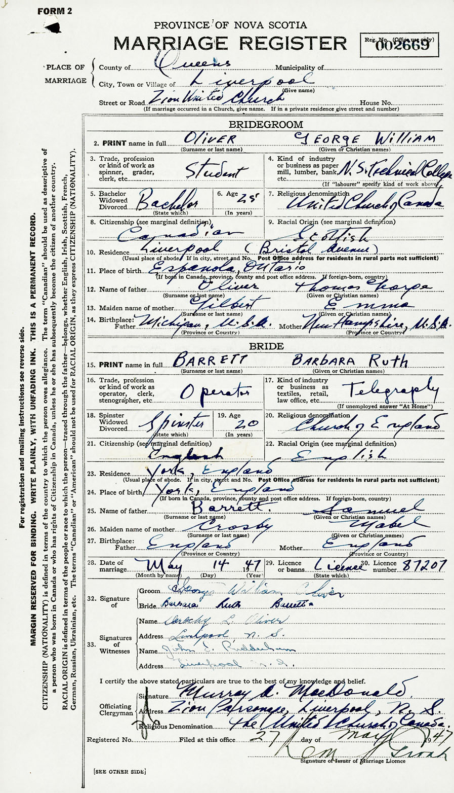28. Date of marriage May 14 1947 29. By license or banns License 30. License number 87207