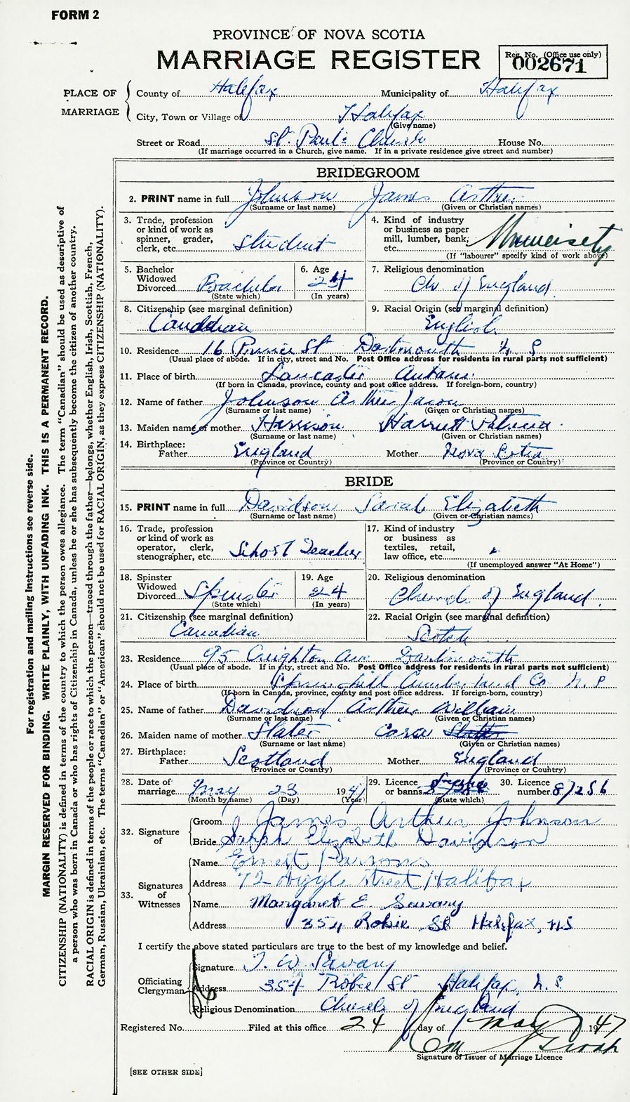 28. Date of marriage May 23 1947 29. By license or banns License 30. License number 87256
