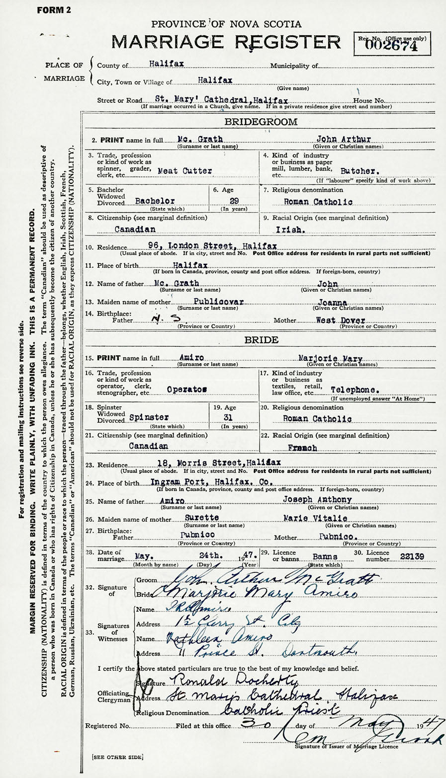 28. Date of marriage May 24 1947 29. By license or banns License 30. License number 22139