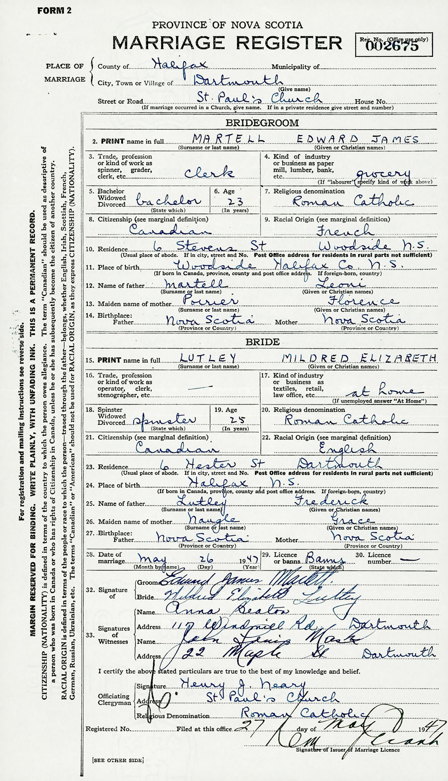 28. Date of marriage May 26 1947 29. By license or banns License 30. License number