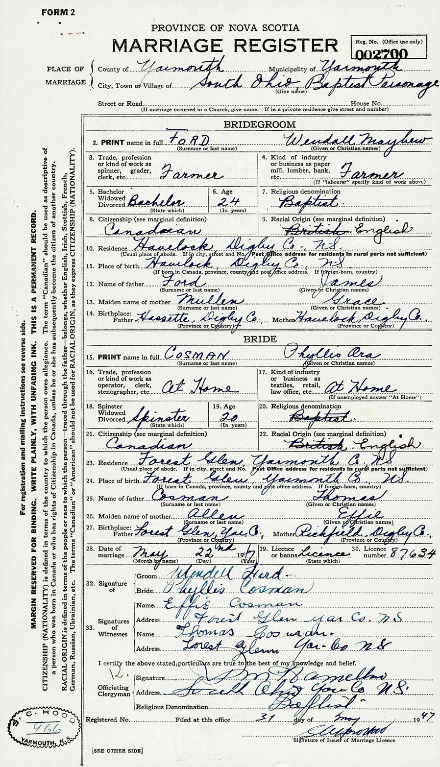 24. Place of birth Forest Glen, Yarmouth County, Nova Scotia