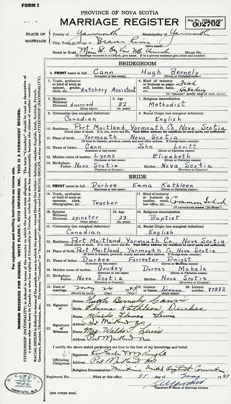 24. Place of birth Port Maitland, Yarmouth County, Nova Scotia