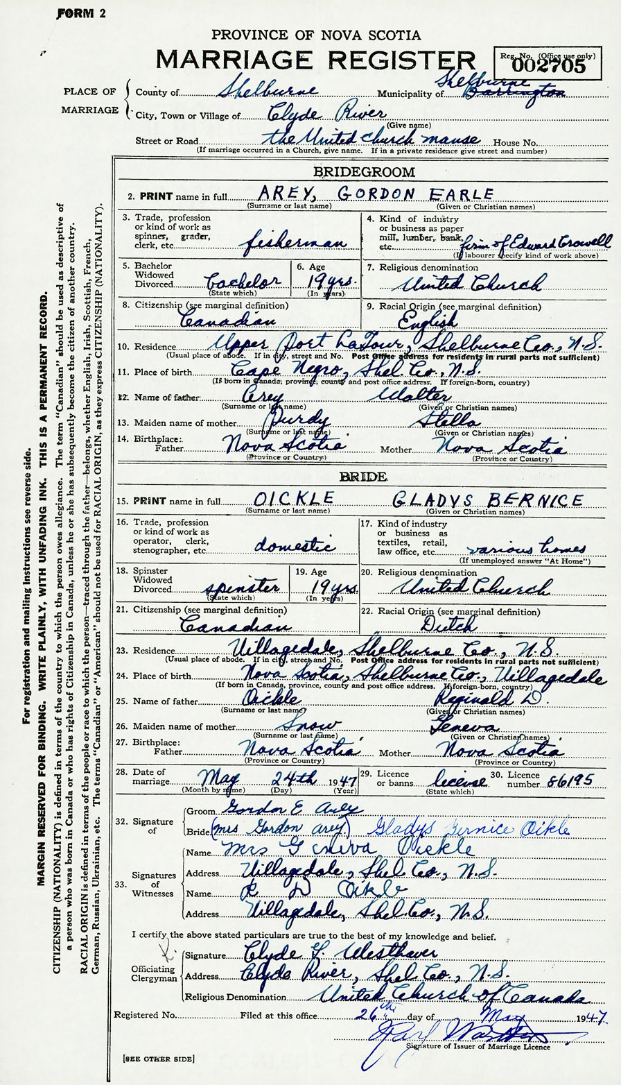 28. Date of marriage May 24 1947 29. By license or banns License 30. License number 86195