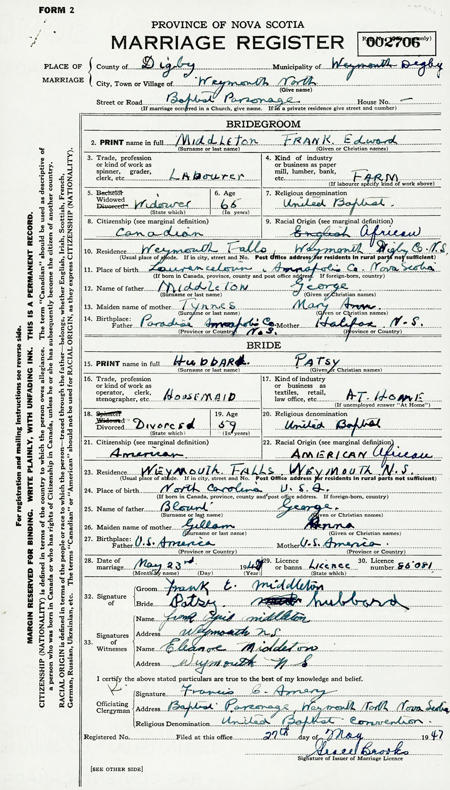 Registration: Year: 1947 number: 002706