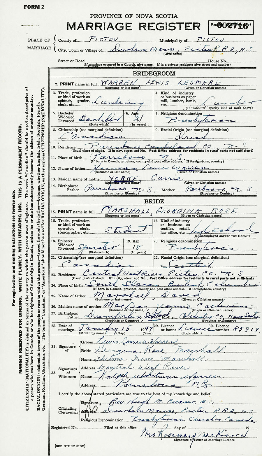 Registration: Year: 1947 number: 002716