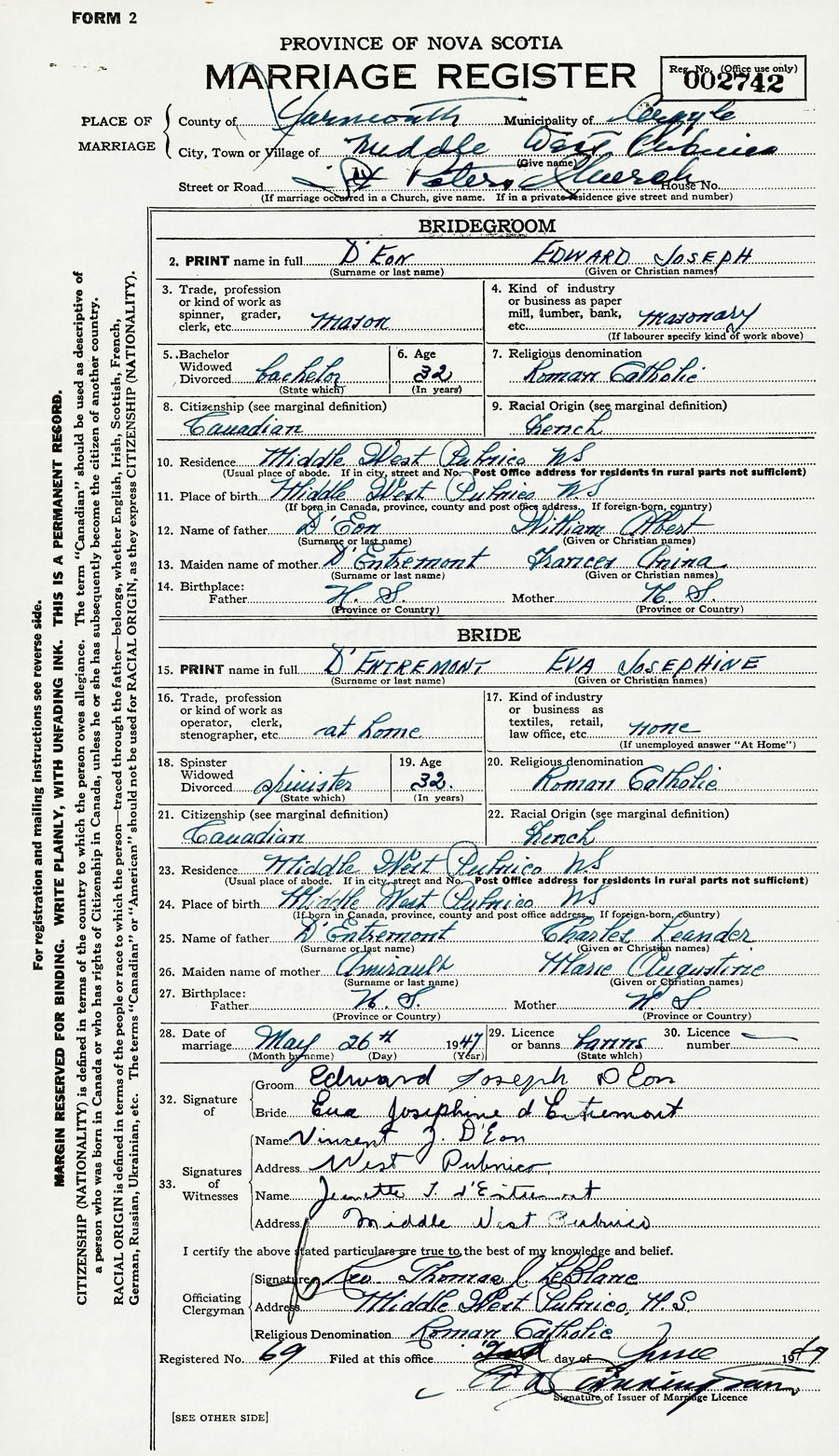 28. Date of marriage May 26 1947 29. By license or banns License 30. License number