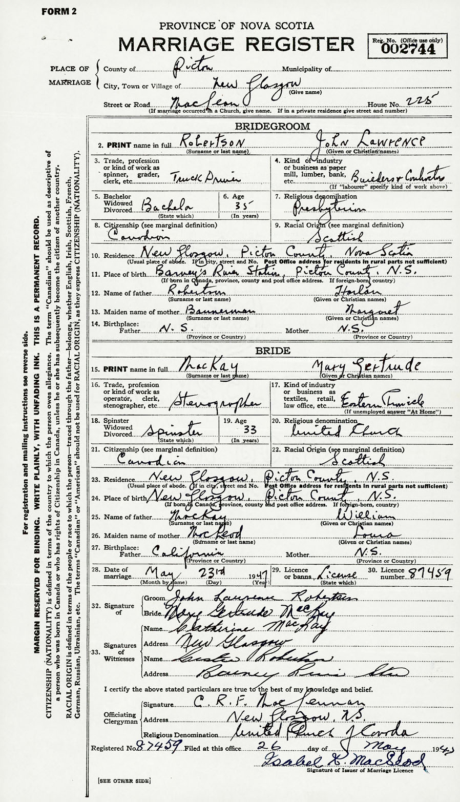 PLACE OF MARRIAGE County of Pictou