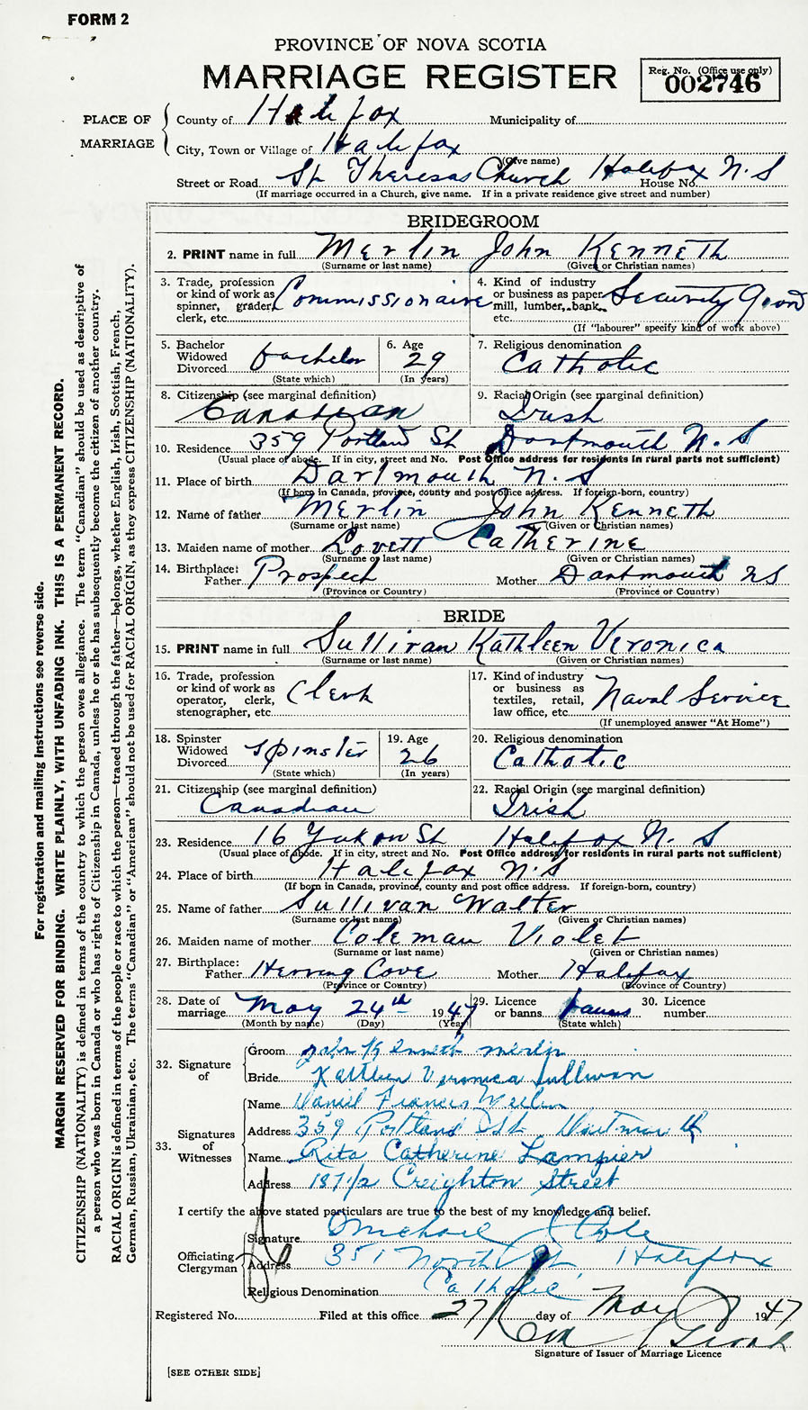 28. Date of marriage May 24 1947 29. By license or banns Banns 30. License number Banns