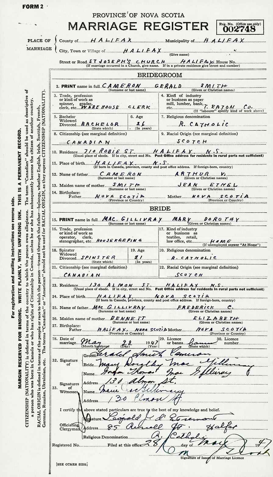 28. Date of marriage May 22 1947 29. By license or banns License 30. License number
