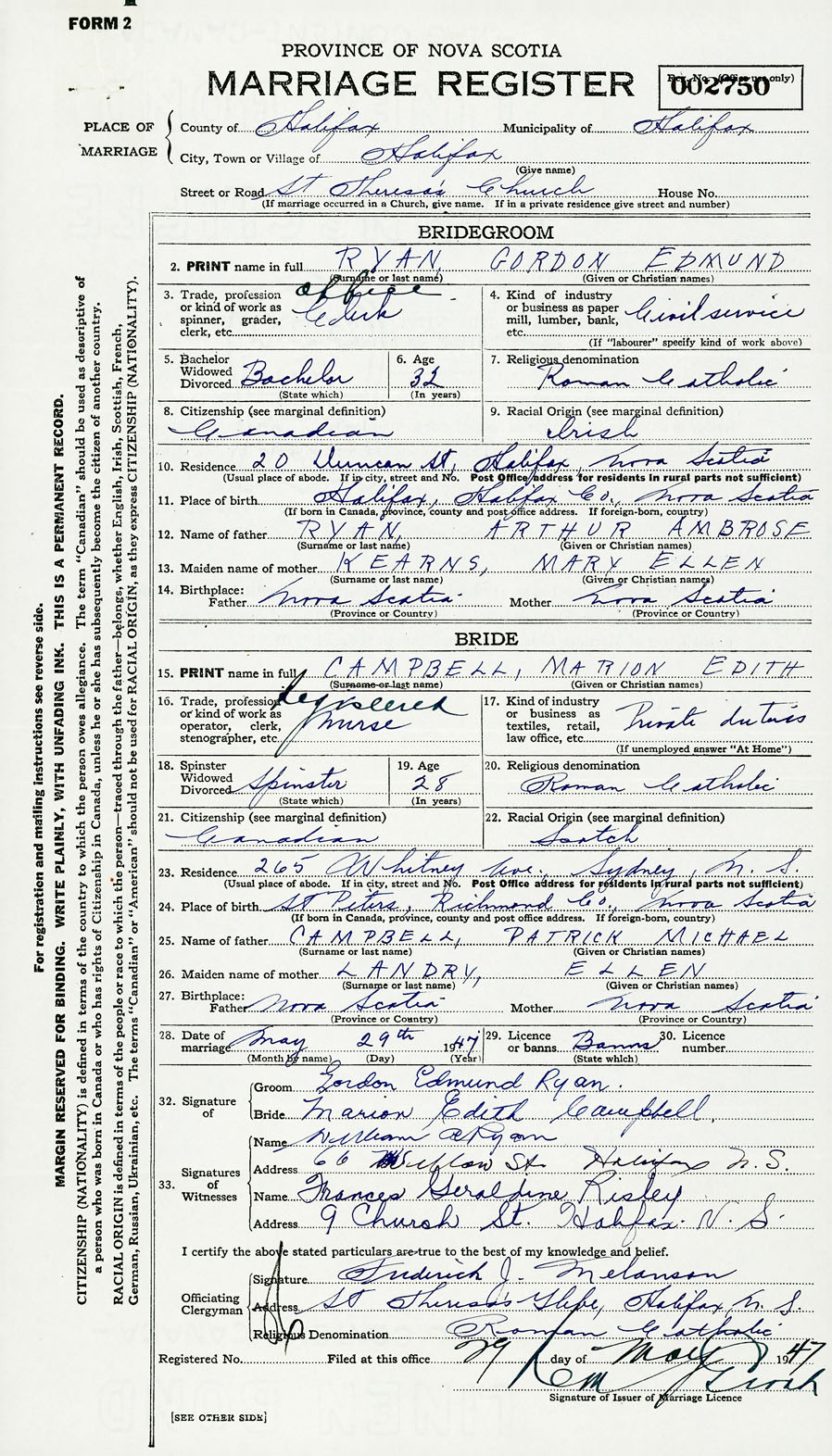 28. Date of marriage May 29 1947 29. By license or banns Banns 30. License number Banns