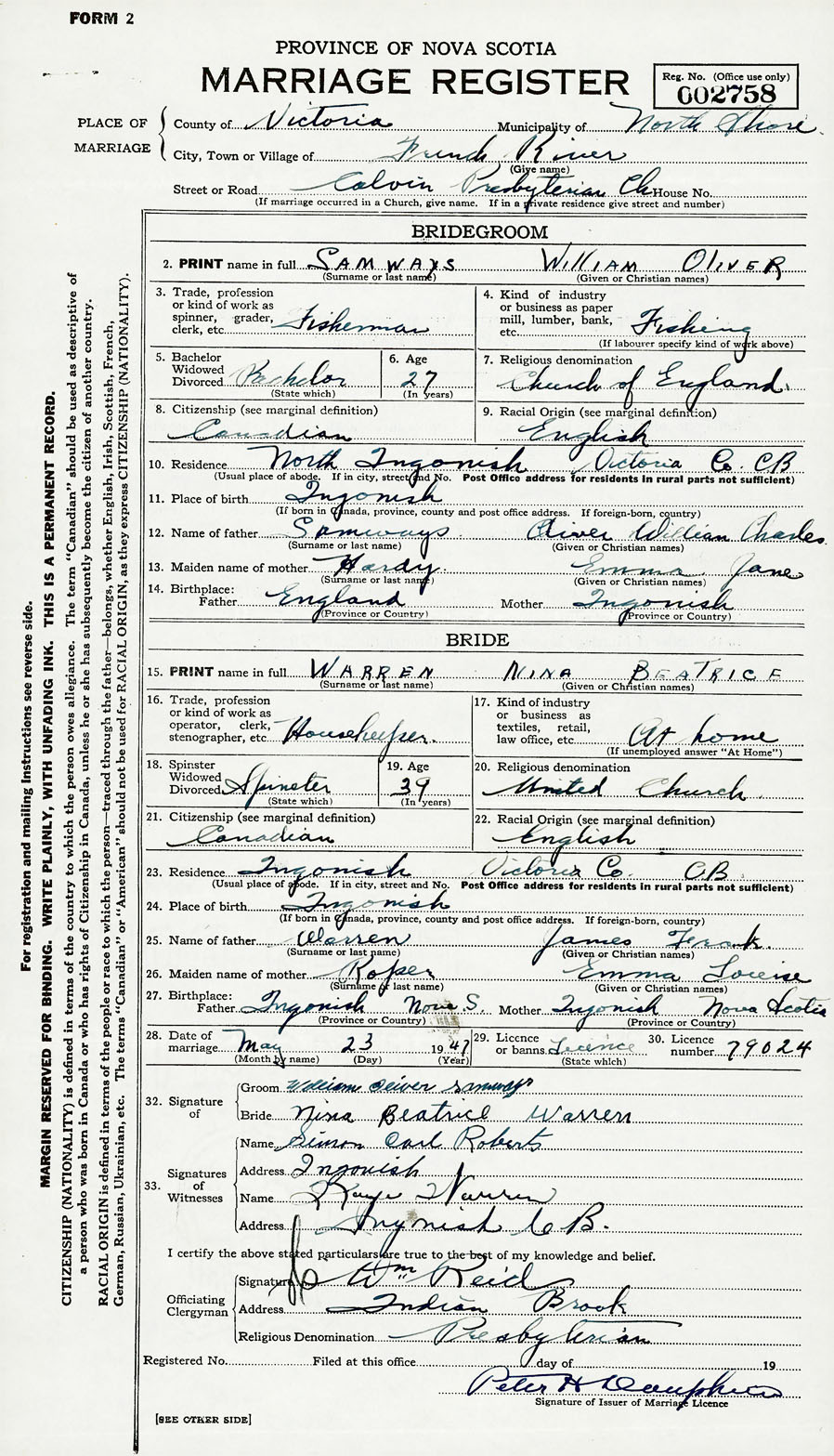 28. Date of marriage May 23 1947 29. By license or banns License 30. License number 79024