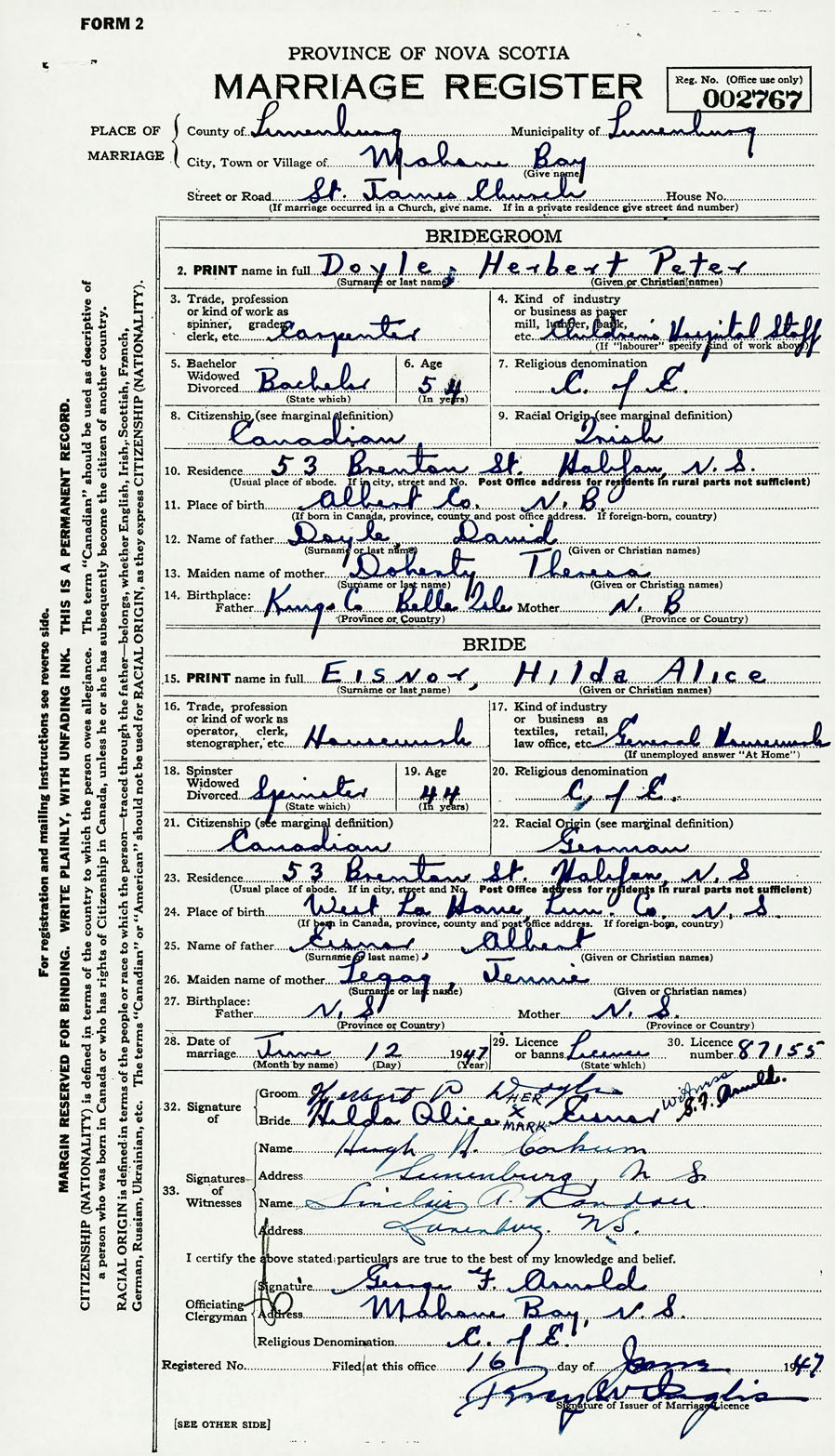 28. Date of marriage June 12 1947 29. By license or banns License 30. License number 87155