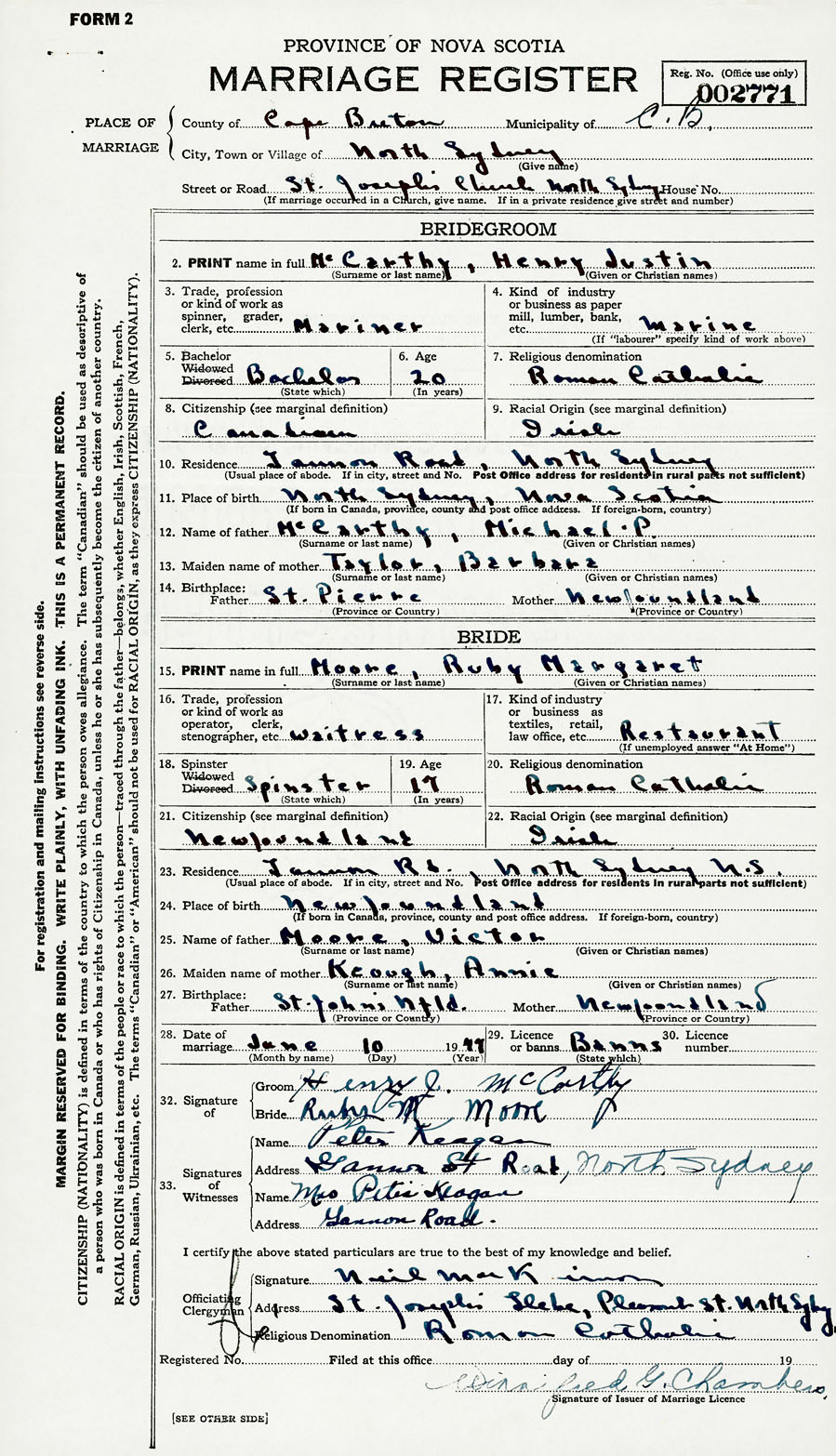 27. Birthplace Father St John’s Nfld Mother Newfoundland