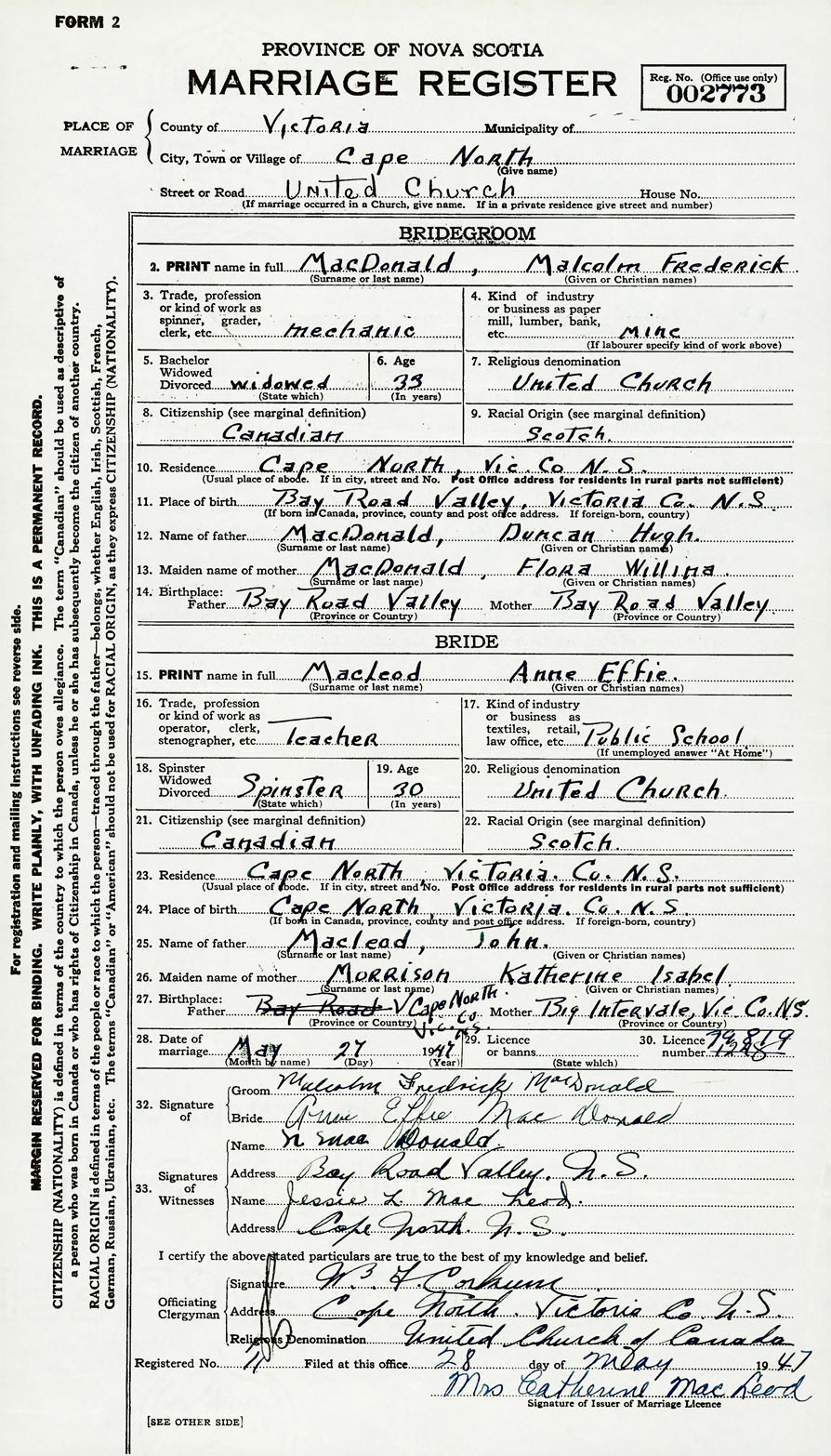 27. Birthplace Father Cape North, Victoria Co, Nova Scotia Mother Big Interval, Victoria Co, Nova Scotia