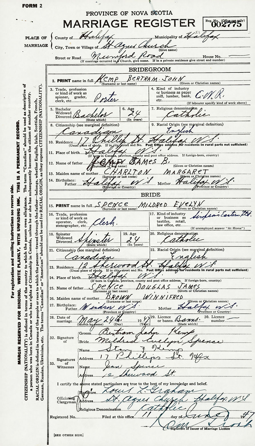 28. Date of marriage May 24 1947 29. By license or banns License 30. License number