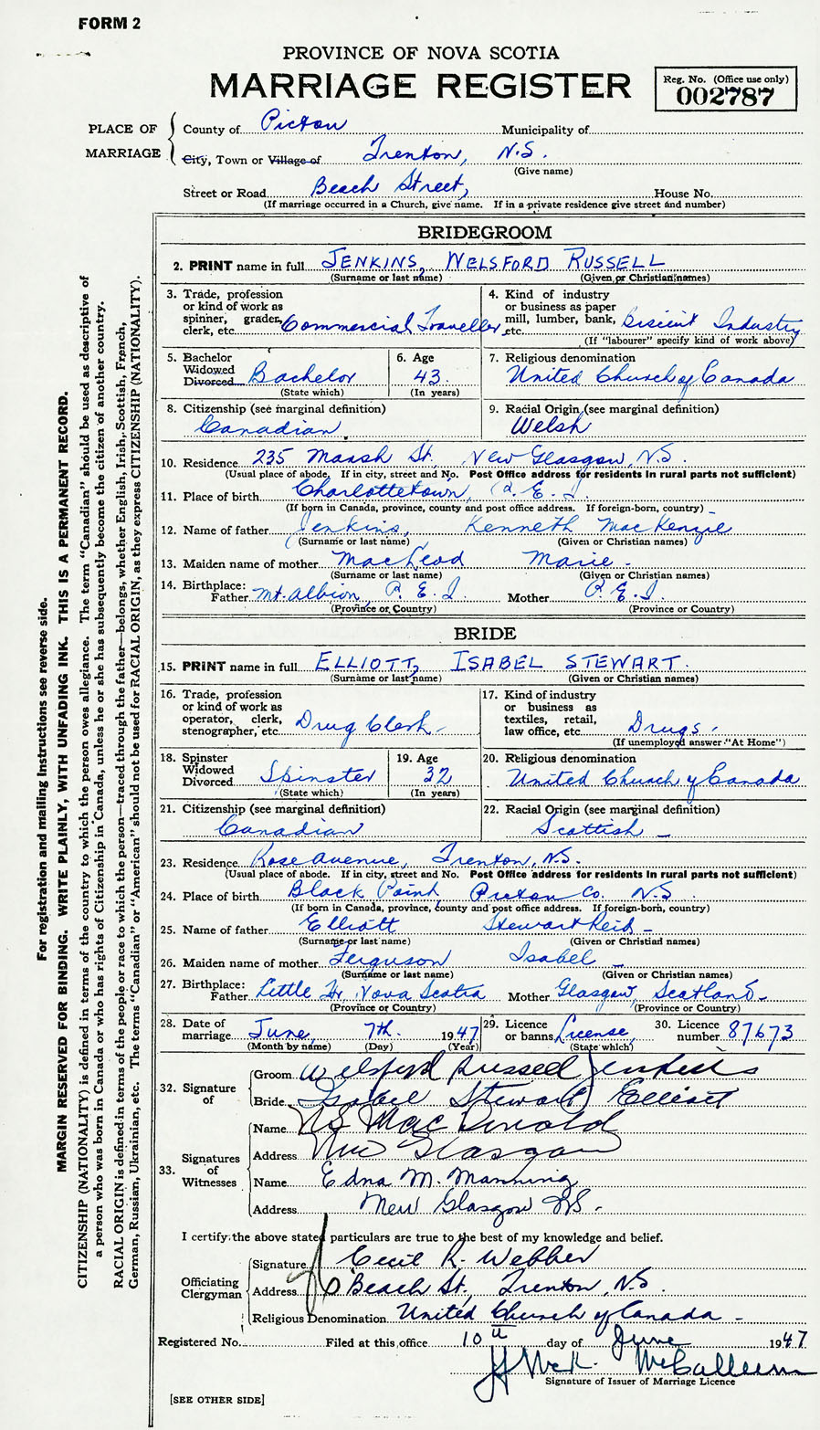 28. Date of marriage June 7 1947 29. By license or banns License 30. License number 87673