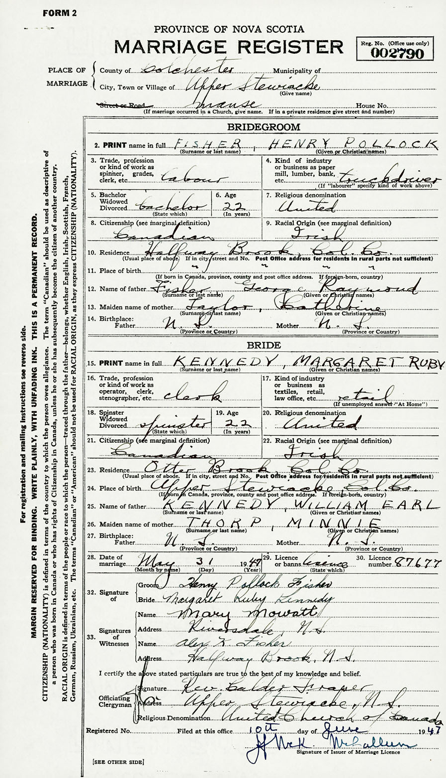 28. Date of marriage May 31 1947 29. By license or banns License 30. License number 87677
