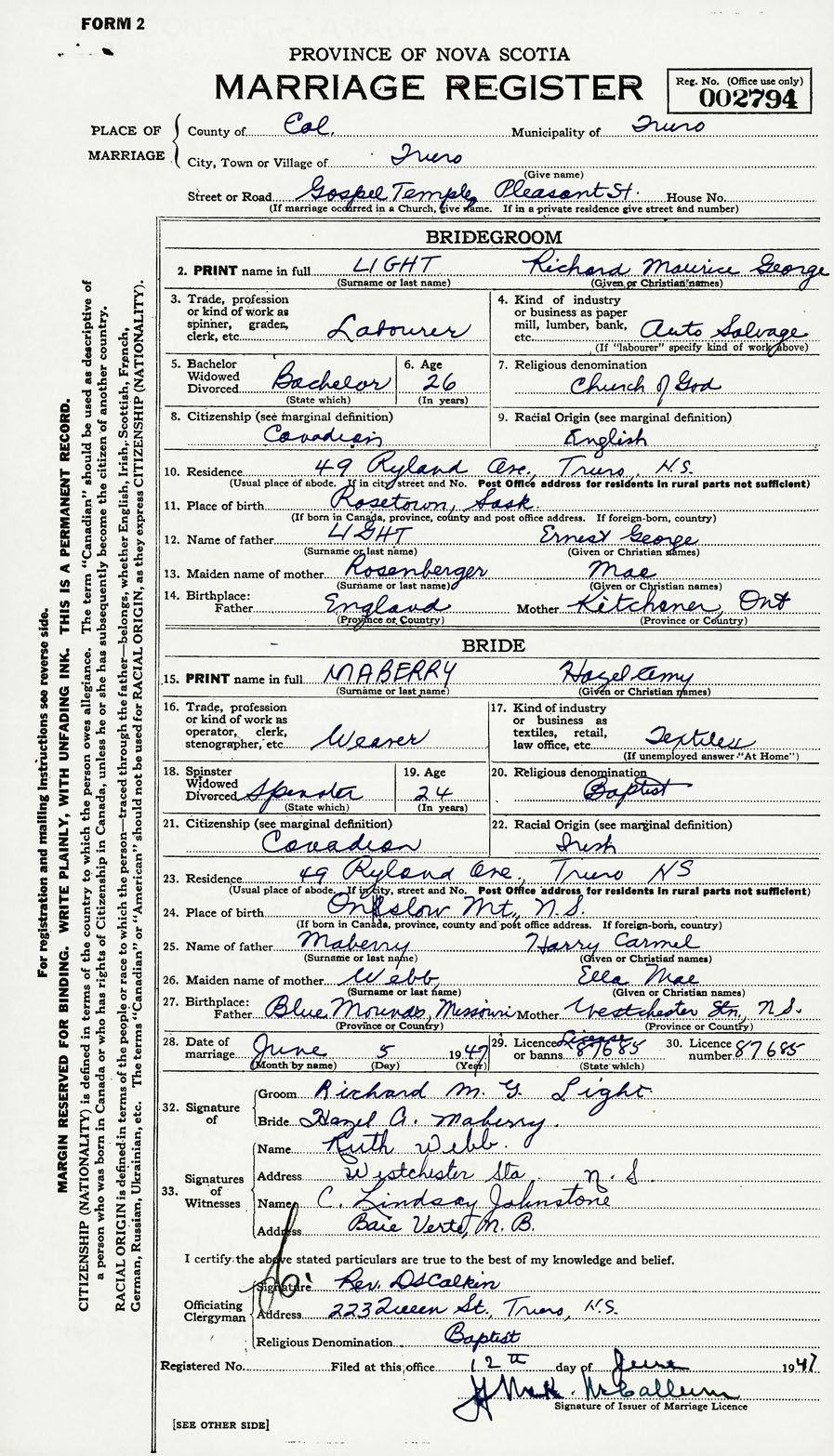 28. Date of marriage June 5 1947 29. By license or banns License 30. License number 87685