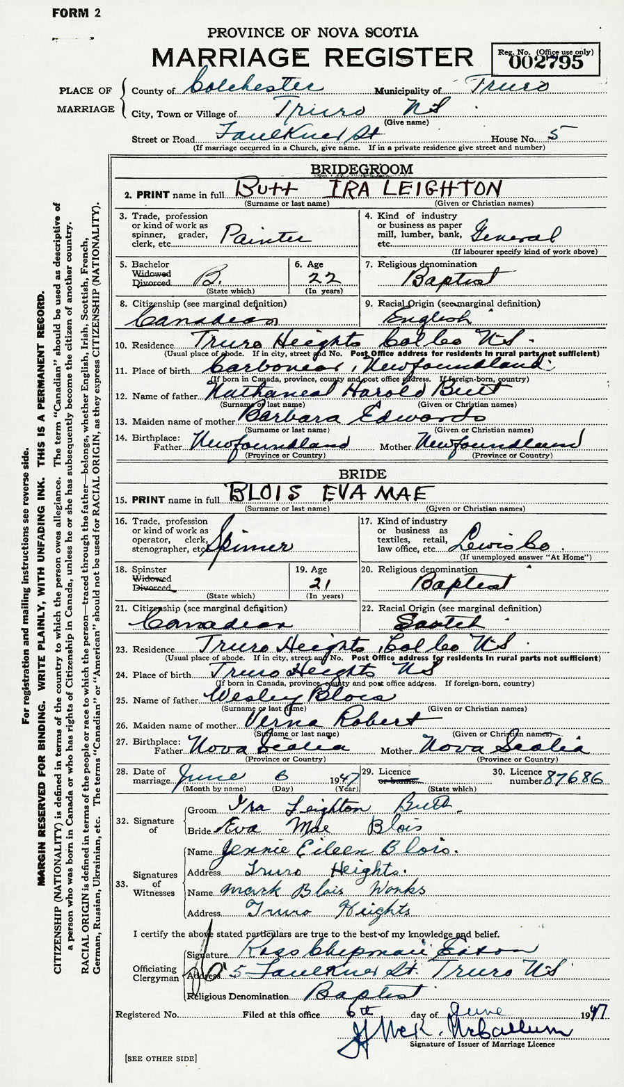 28. Date of marriage June 6 1947 29. By license or banns License 30. License number 87686