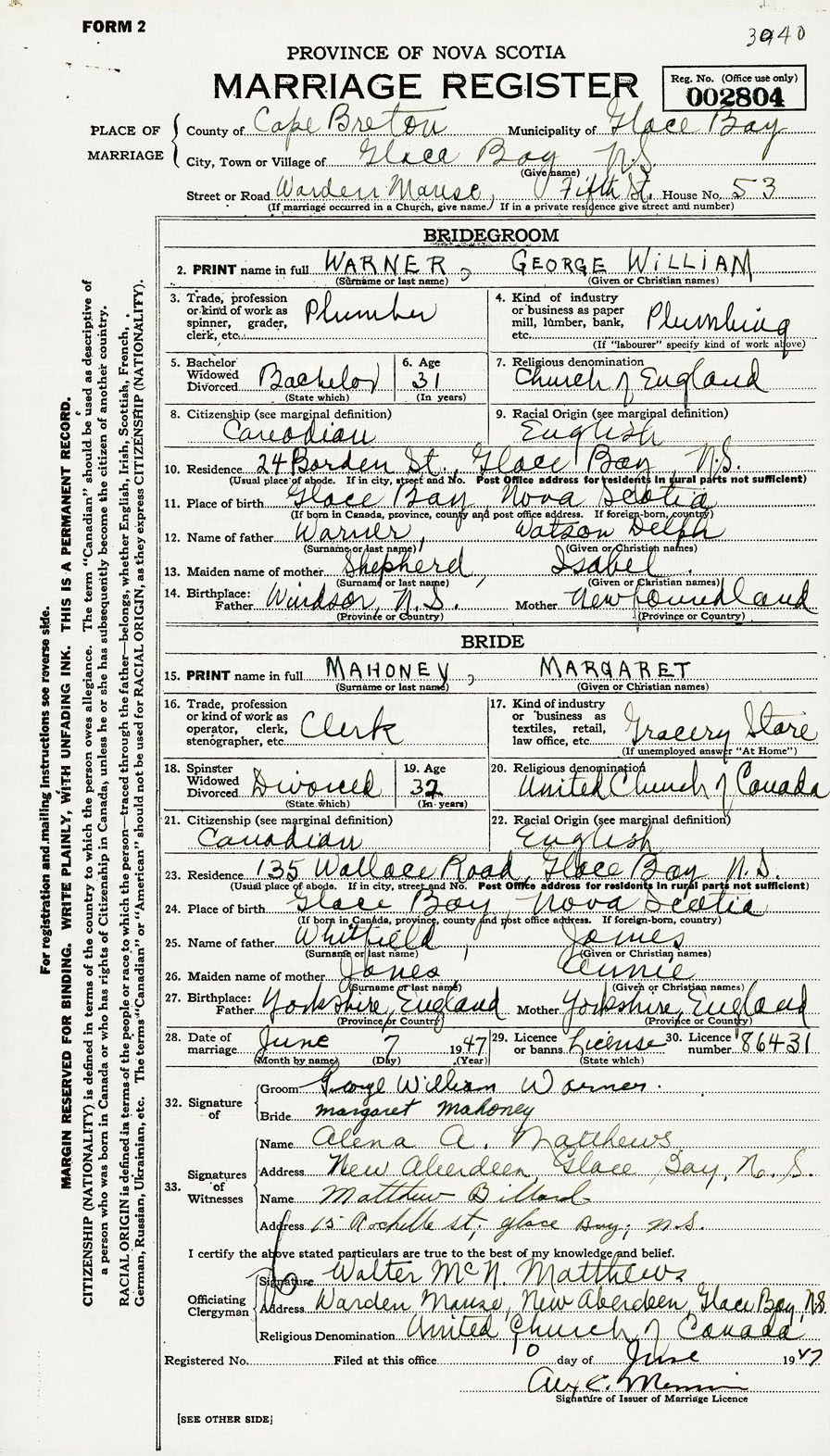 28. Date of marriage June 7 1947 29. By license or banns License 30. License number 86431
