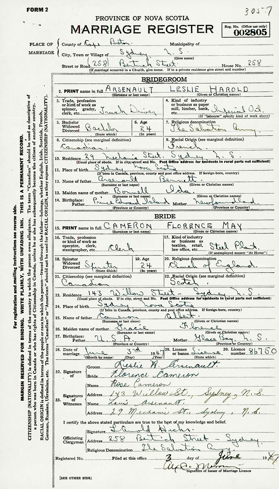 28. Date of marriage June 3 1947 29. By license or banns License 30. License number 86750