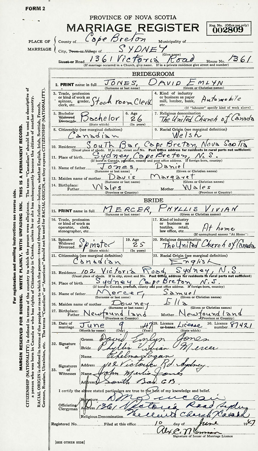 28. Date of marriage June 9 1947 29. By license or banns License 30. License number 87421