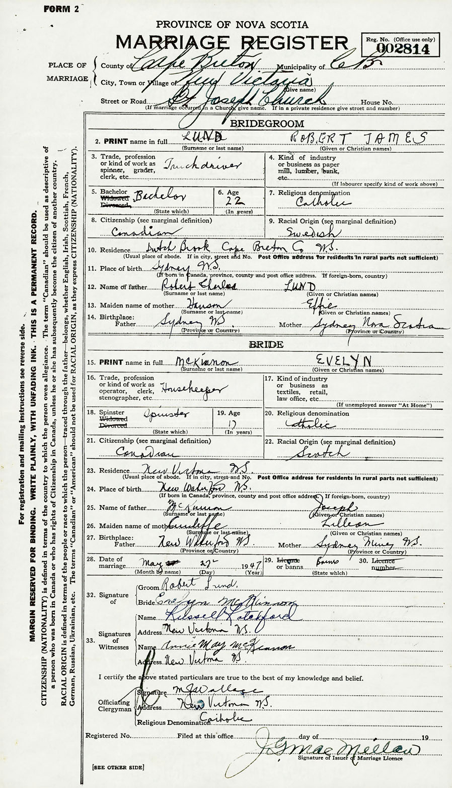27. Birthplace Father New Waterford Nova Scotia Mother Sydney Mines Nova Scotia