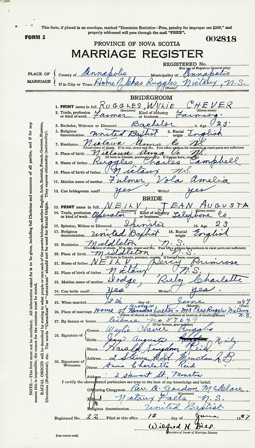 26. Place of marriage Home of Charles Ruggles Nictaux, Annapolis County