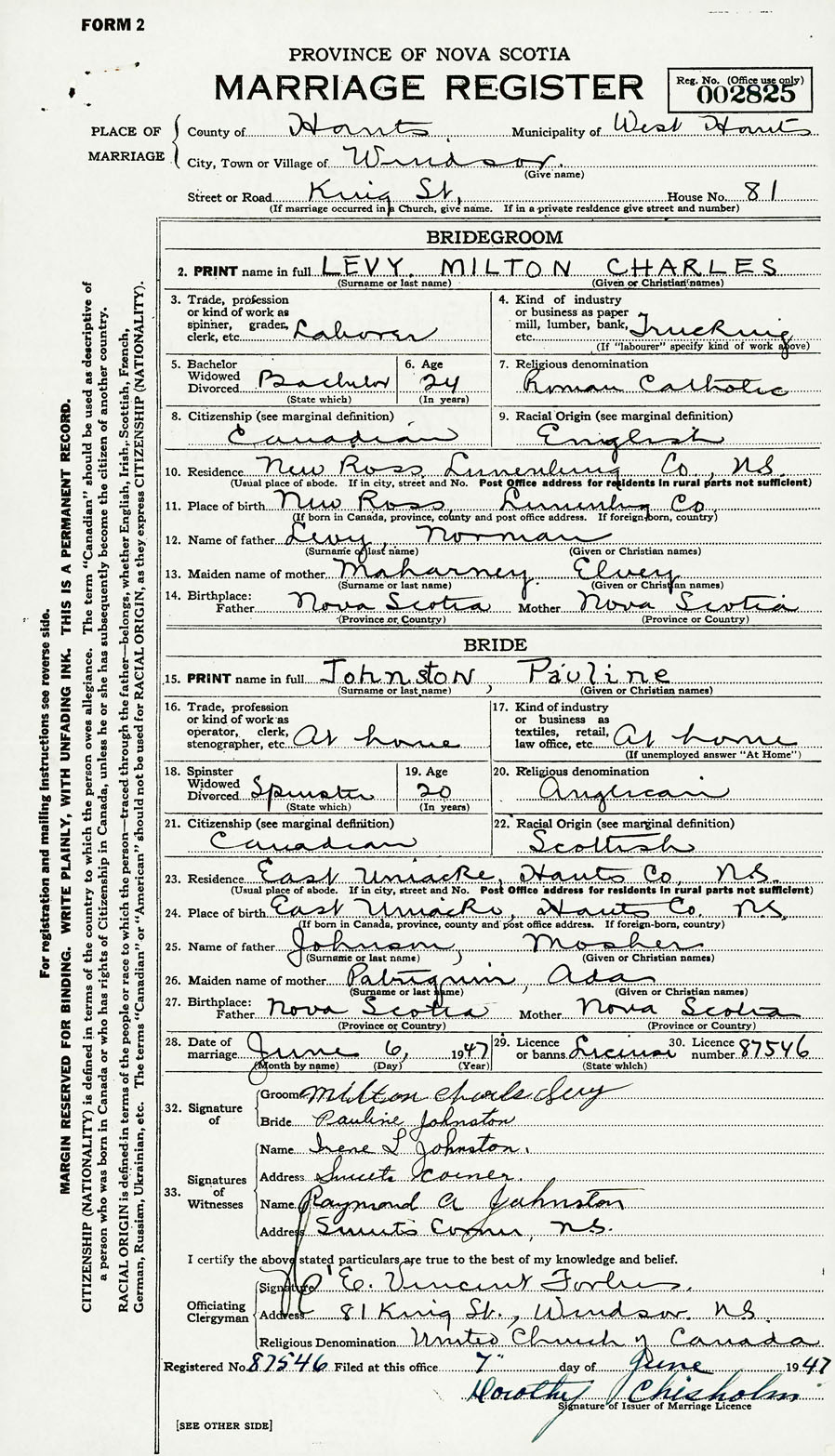 28. Date of marriage June 6 1947 29. By license or banns License 30. License number 87546