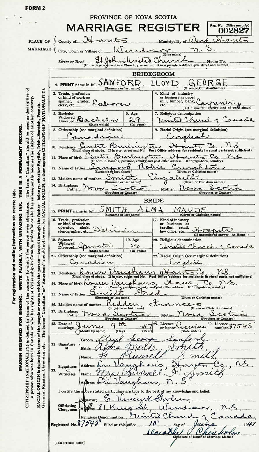 28. Date of marriage June 9 1947 29. By license or banns License 30. License number 87545