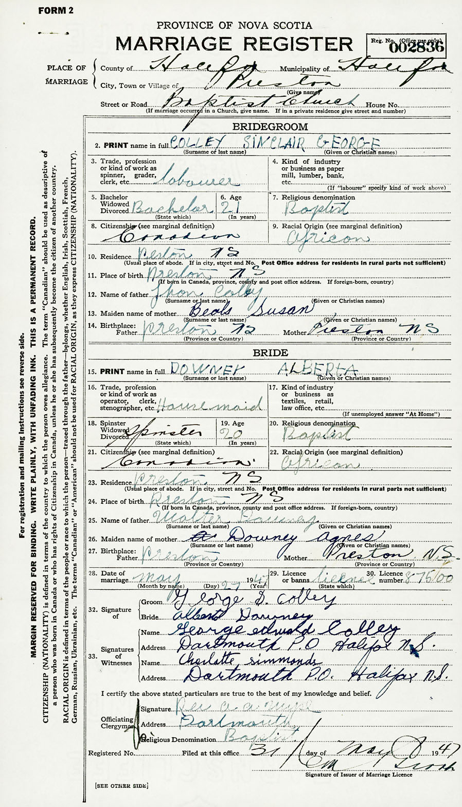 24. Place of birth Preston, Nova Scotia