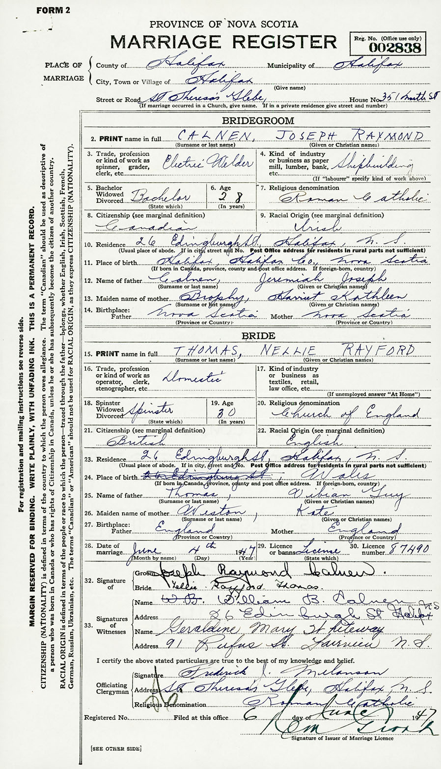 28. Date of marriage June 4 1947 29. By license or banns License 30. License number 87490