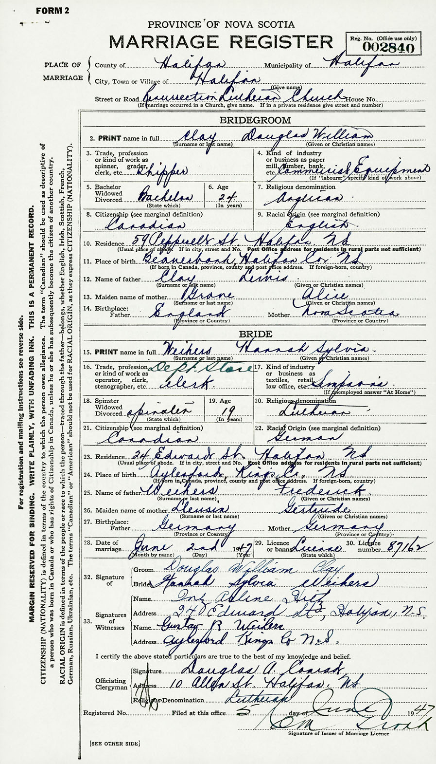 28. Date of marriage June 2 1947 29. By license or banns License 30. License number 87162