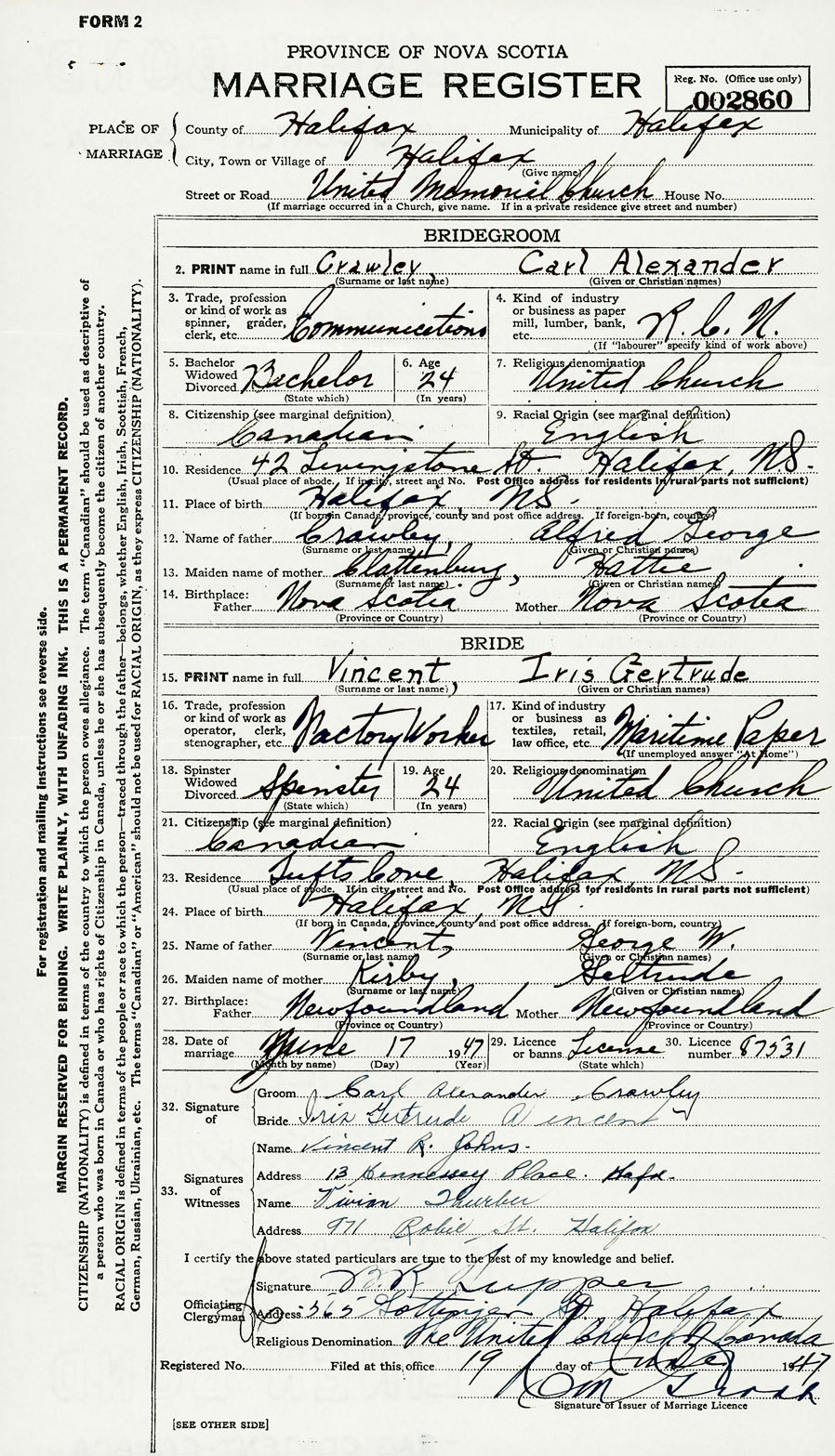 28. Date of marriage June 17 1947 29. By license or banns License 30. License number 87531