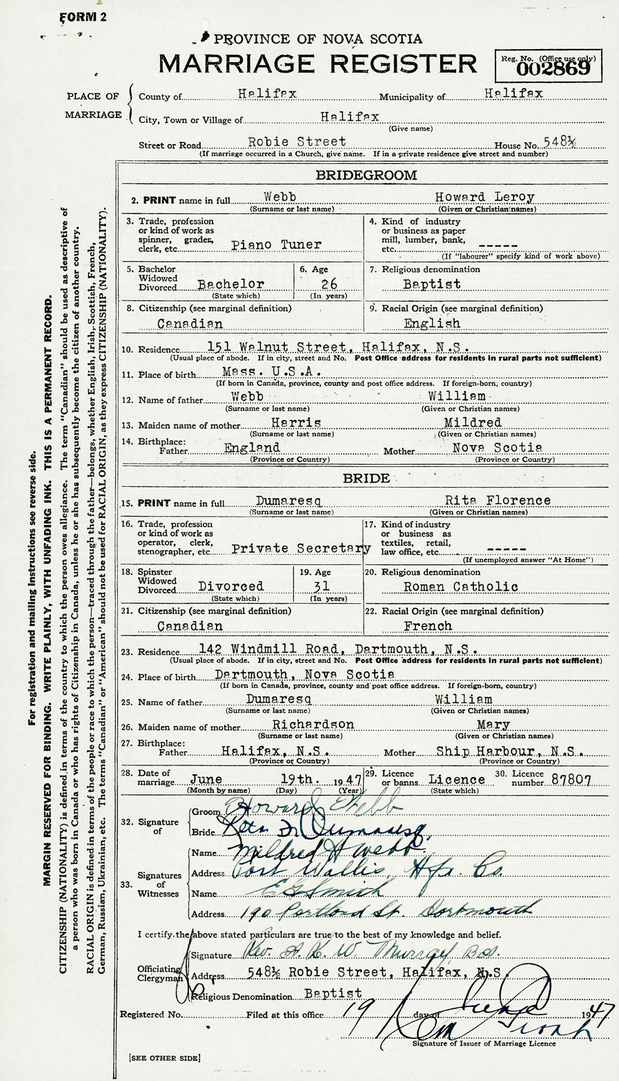 28. Date of marriage June 19 1947 29. By license or banns License 30. License number 87807