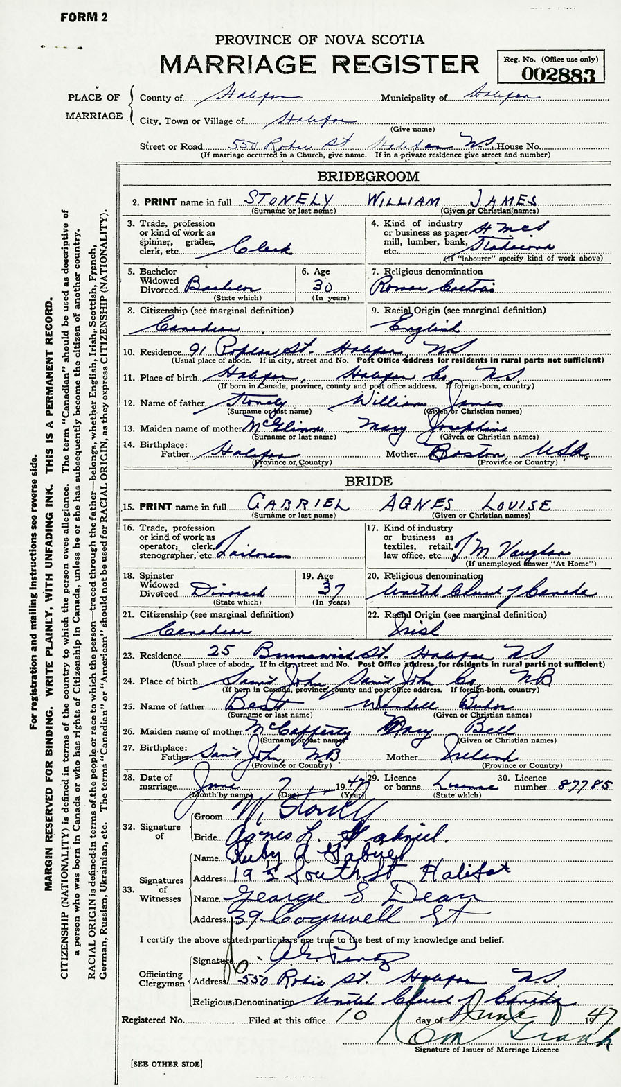 28. Date of marriage June 7 1947 29. By license or banns License 30. License number 87785