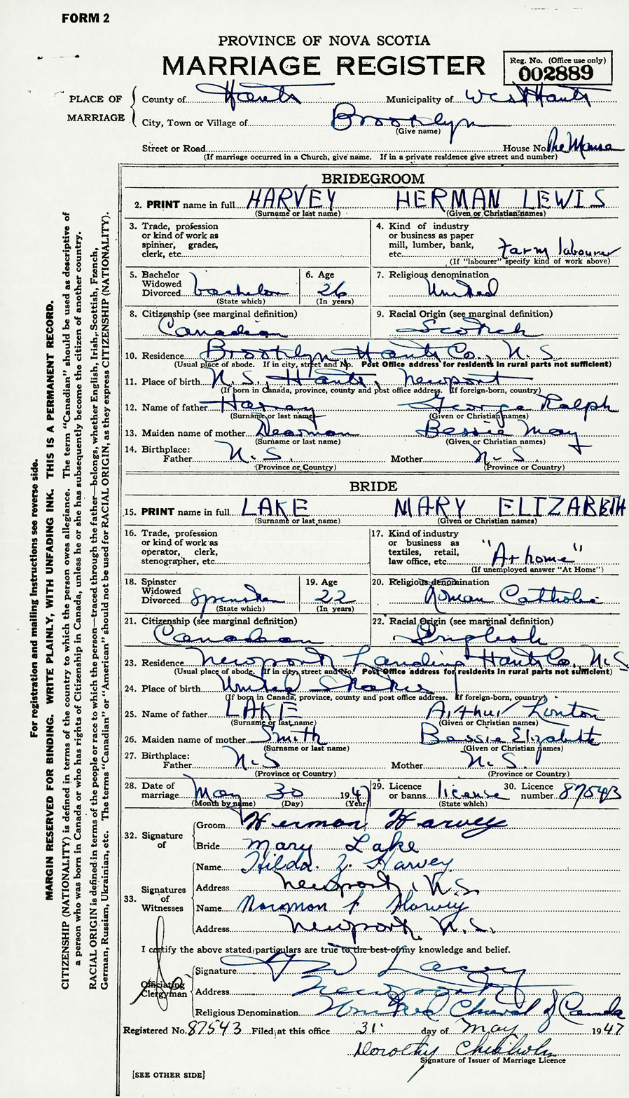 28. Date of marriage May 30 1947 29. By license or banns License 30. License number 87543