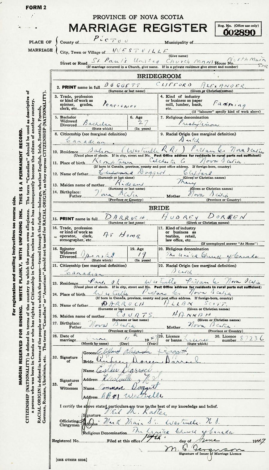 24. Place of birth Westville Pictou County Nova Scotia