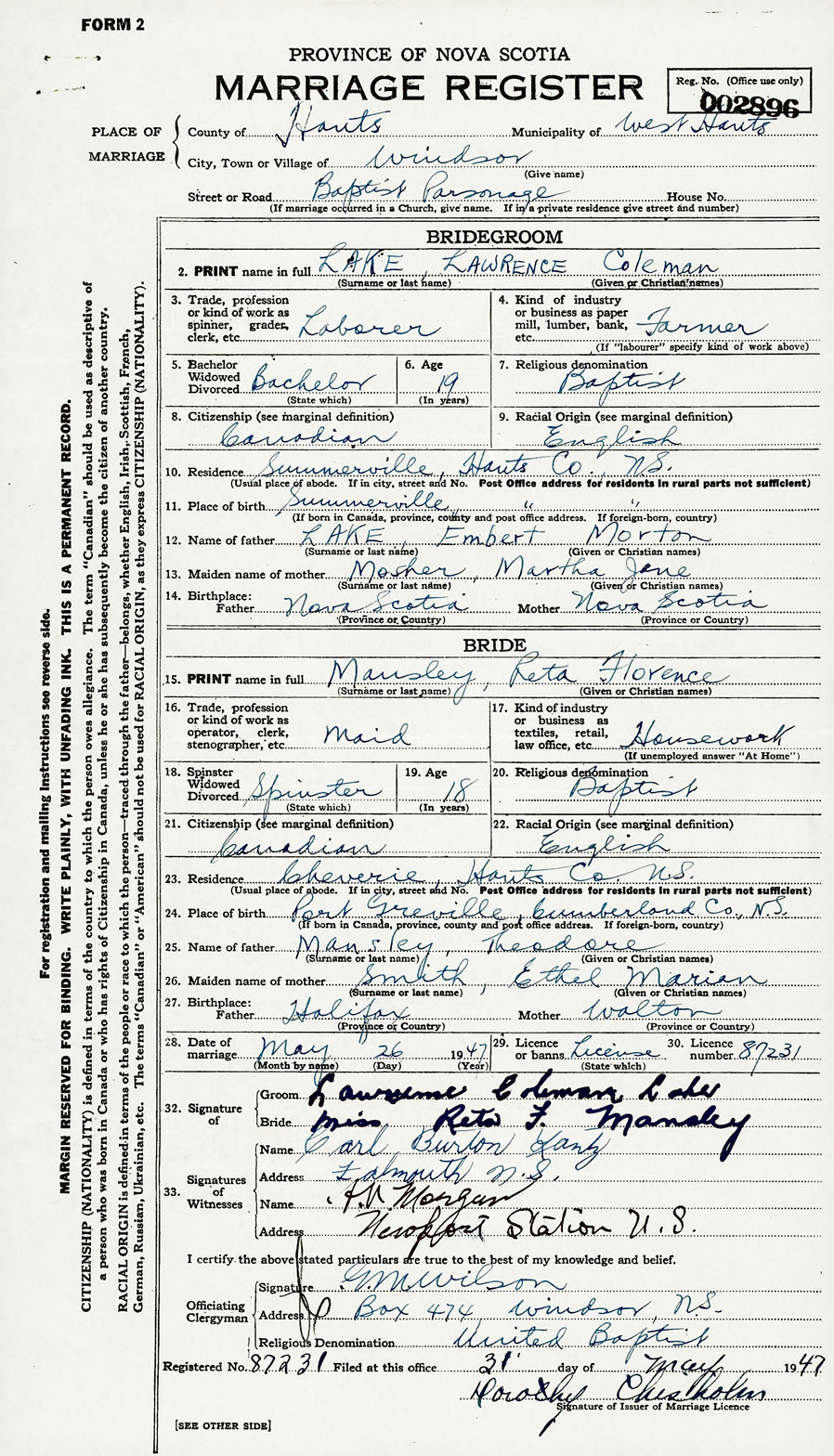 Registration: Year: 1947 number: 002896