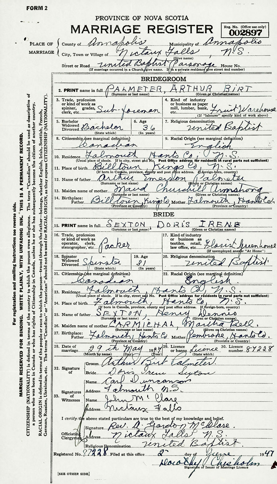 28. Date of marriage May 29 1947 29. By license or banns License 30. License number 87228