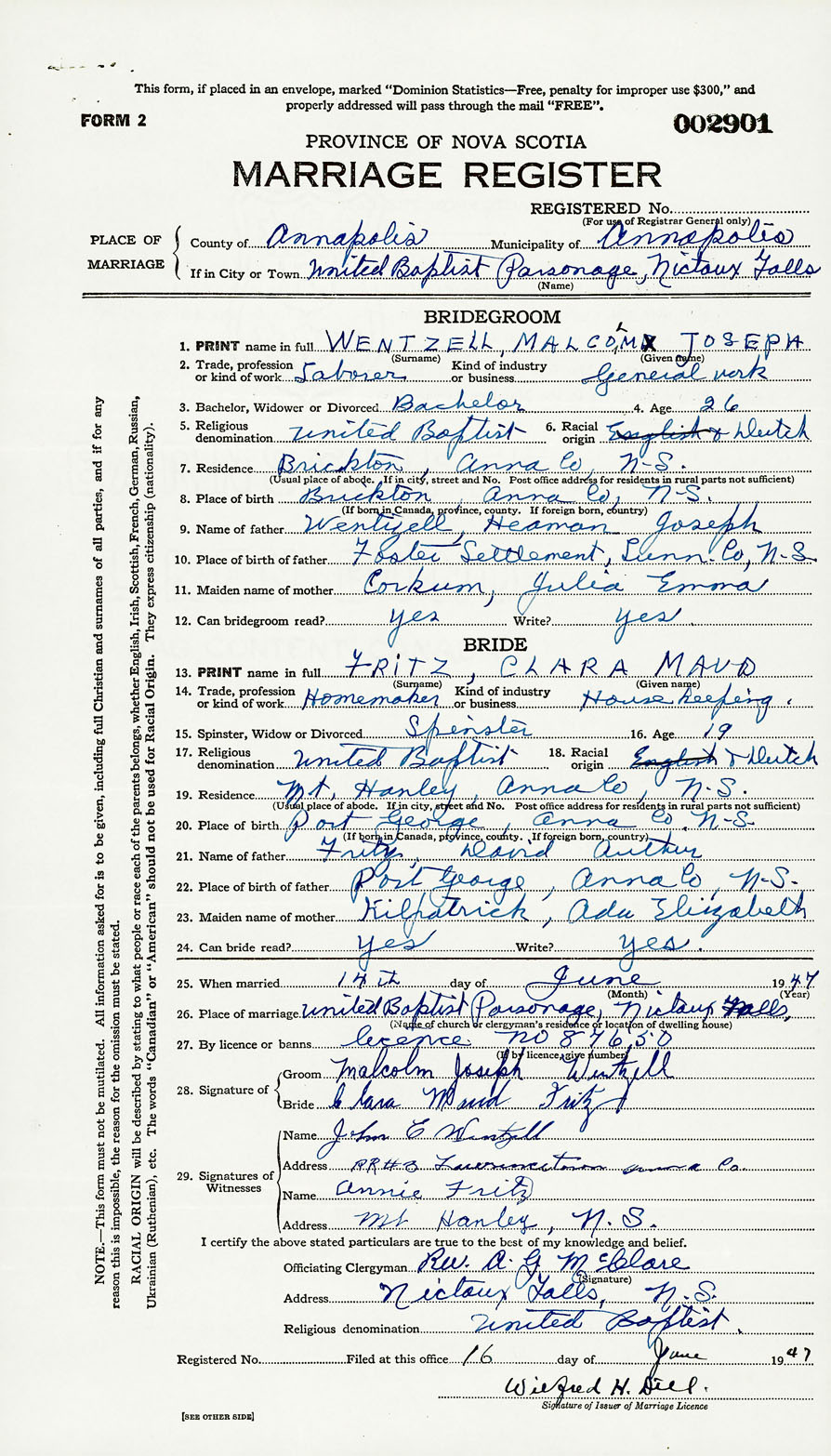 26. Place of marriage United Baptist Parsonage Nictaux Falls, Annapolis County