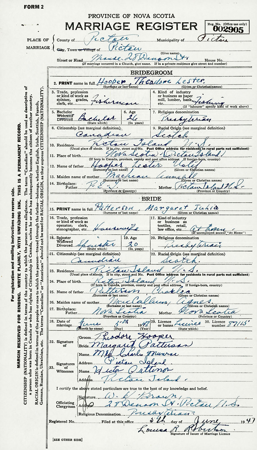 14. Birthplace Father Prince Edward Island Mother Pictou Island, Nova Scotia