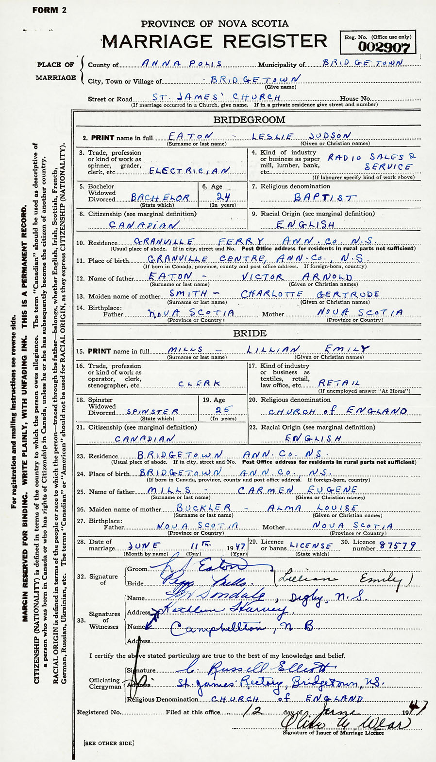 28. Date of marriage June 11 1947 29. By license or banns License 30. License number 87579