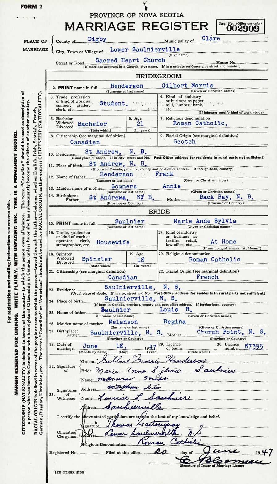 28. Date of marriage June 18 1947 29. By license or banns License 30. License number 87395