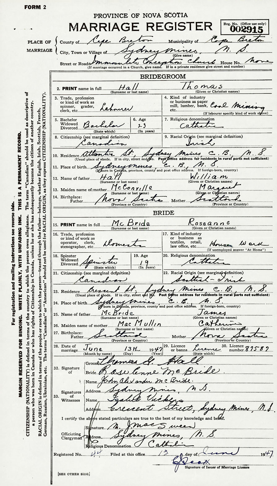 11. Place of birth Sydney Mines, Cape Breton, Nova Scotia