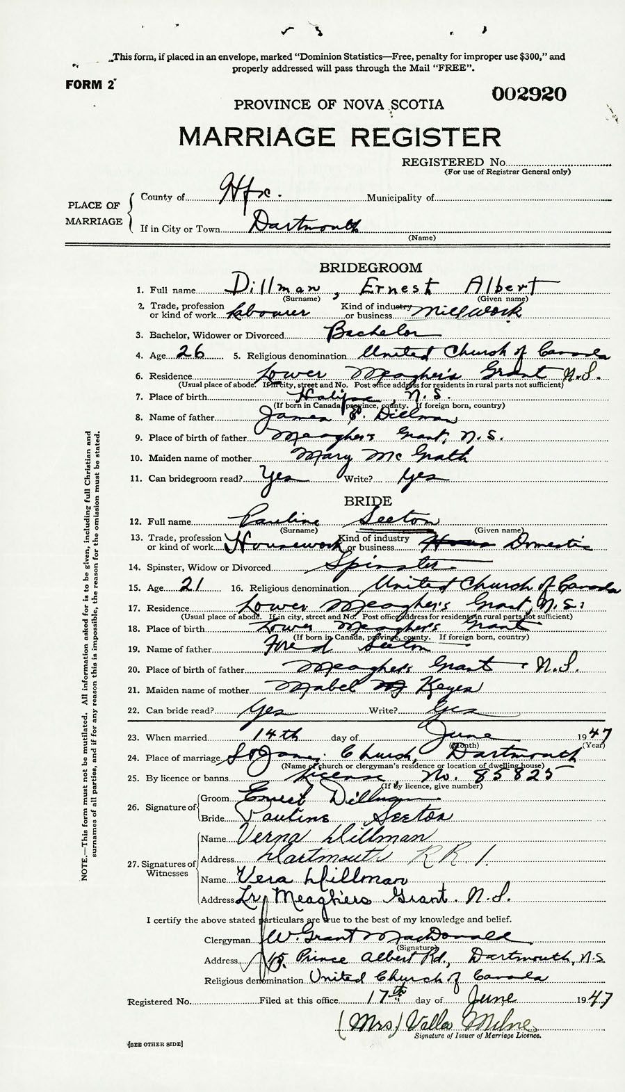 PLACE OF MARRIAGE County of Halifax in City or Town Dartmouth