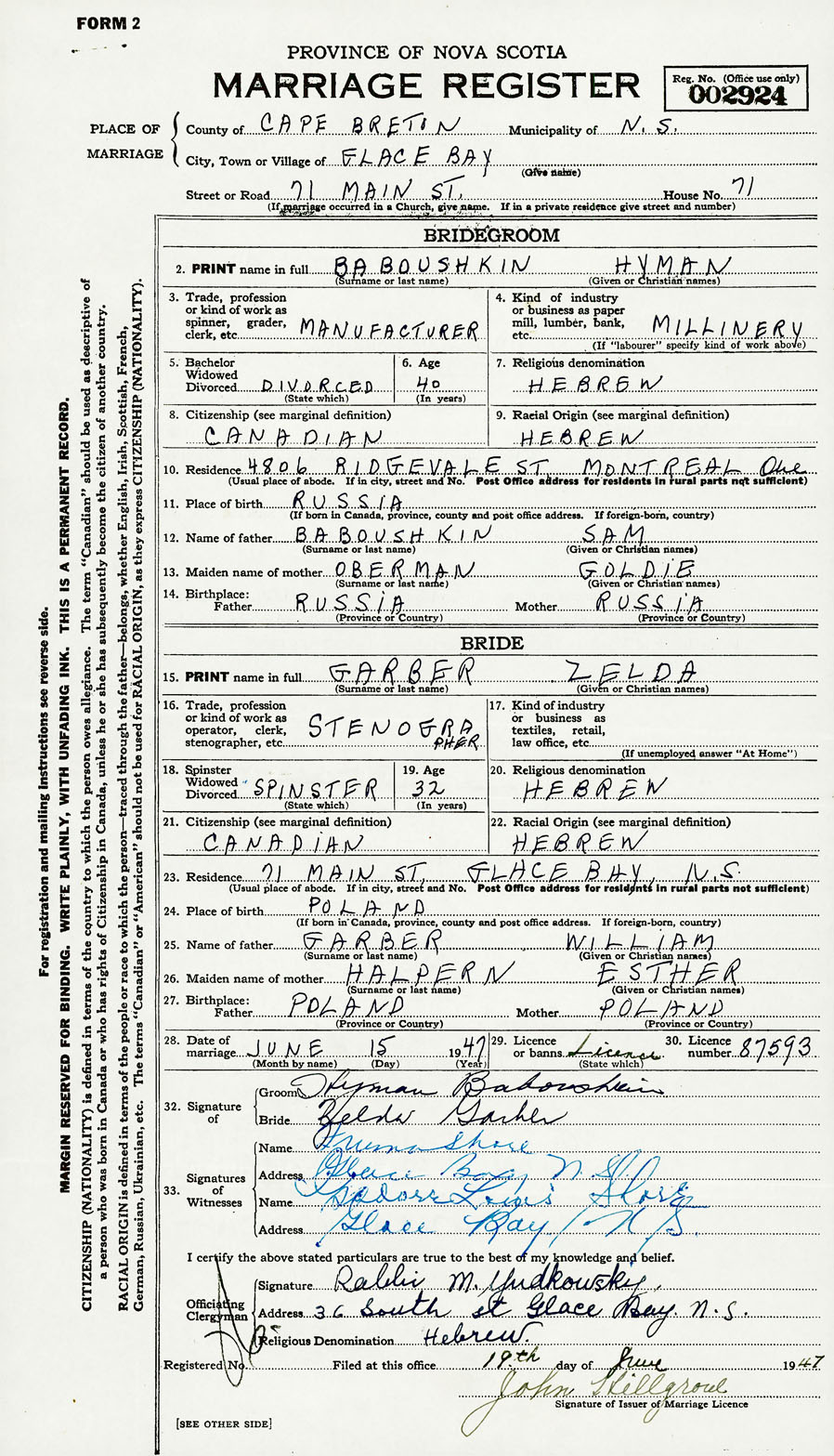 28. Date of marriage June 15 1947 29. By license or banns License 30. License number 87593