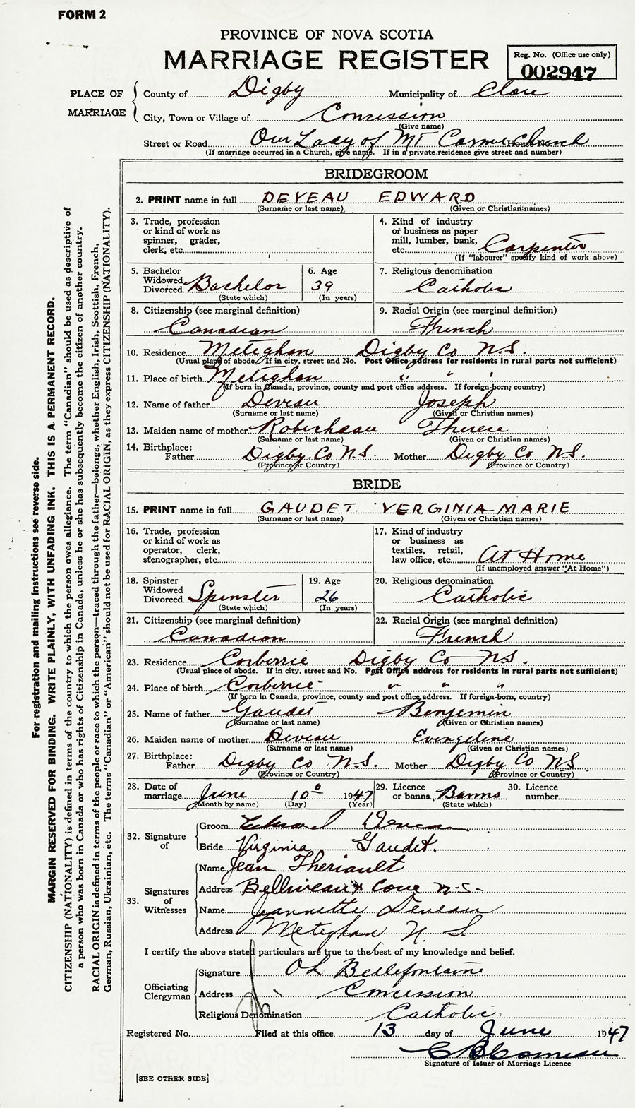 28. Date of marriage June 10 1947 29. By license or banns License 30. License number