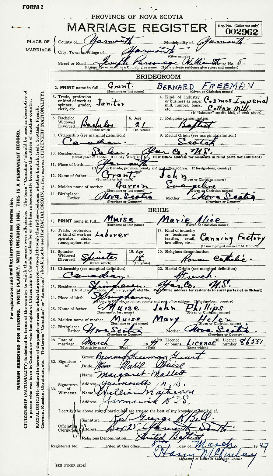Registration: Year: 1947 number: 002962
